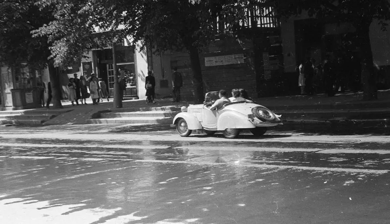 O altă fotografie, din 1957, surprinde un moment din viața de zi cu zi a clujenilor. Se poate observa un automobil reprezentativ pentru acea perioadă, care circula pe străzile ude ale Pieții Unirii, zonă care acum este pietonală.