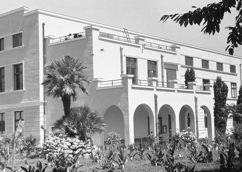 Fotografia din Grădina Botanică din Cluj a fost realizată în perioada construirii serelor mari (1957-1960). În acea perioadă, s-au reconstruit și alei, existând o constantă preocupare pentru menținerea, îmbunătățirea și modernizarea aspectului clădirii și împrejurărilor.