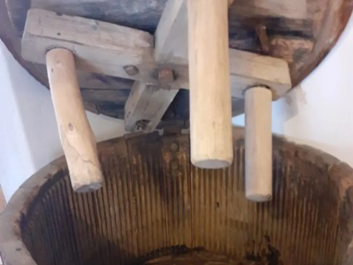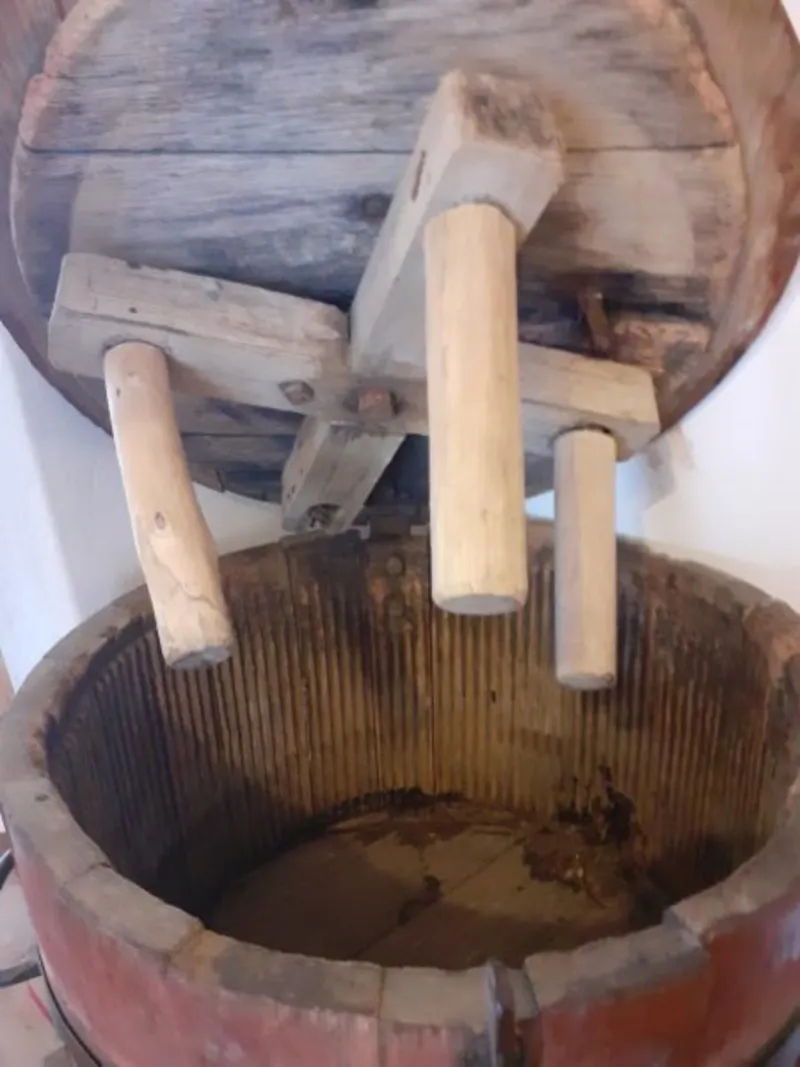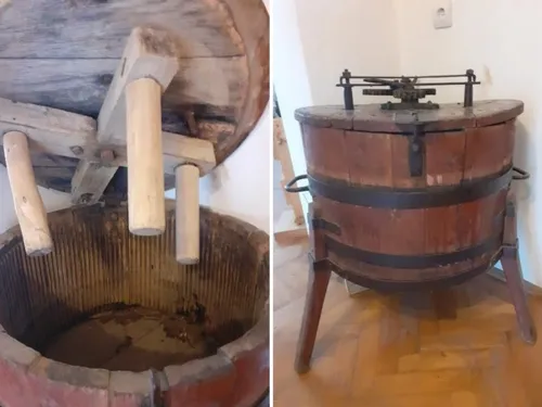 Această mașinărie a fost confecționată din doage de lemn, fixate și întărite prin intermediul a trei cercuri metalice: „În centrul capacului, întărit în zona mediană cu o bandă metalică, este montat un ax metalic acționat de un mecanism format din două roți dințate, din metal. La rândul lor, aceste roți sunt acționate de o tijă metalică așezată în plan paralel cu capacul mașinii, la o distanță de 8 centimetri față de acesta.