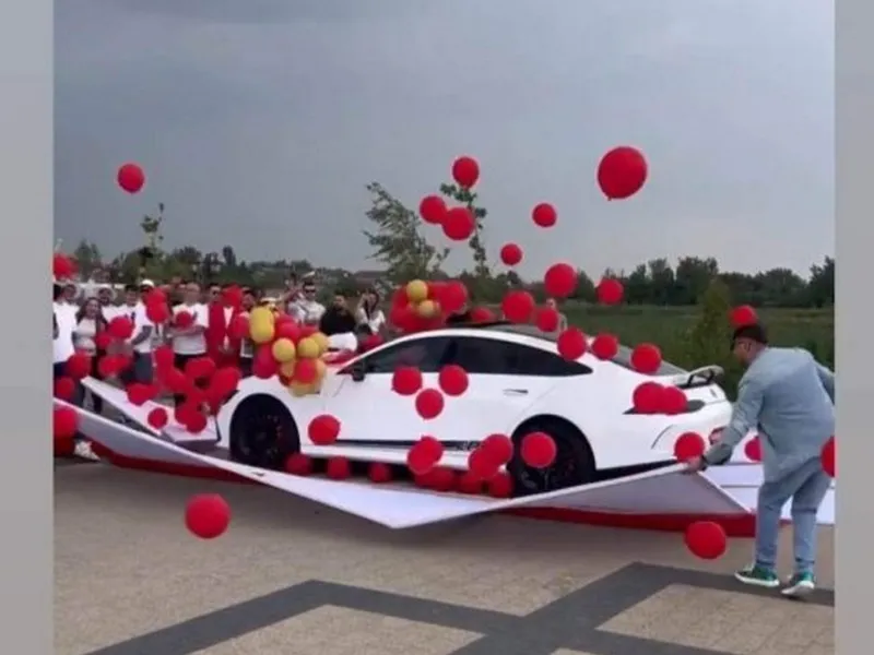 Mercedes-ul de peste 120.000 € a fost adus la petrecerea de ziua dansatoarei pe ascuns și a fost „ambalat” cu baloane în fața localului, în spatele unui paravan de culoare albă, care a fost dat jos de manelist când și-a făcut apariția sărbătorita.