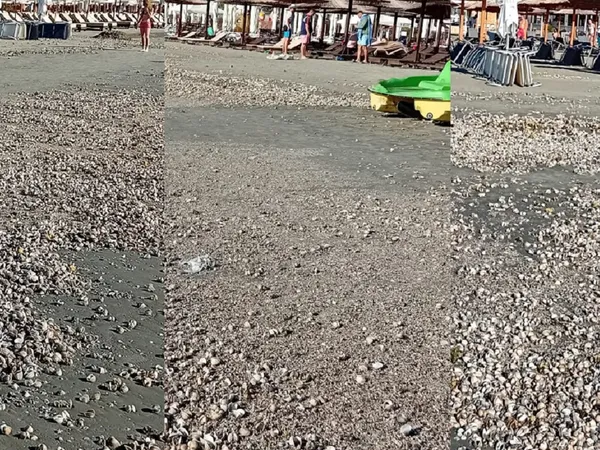 Furtuna de pe litoral a lăsat plajele într-o stare dezolantă. Sunt straturi întregi de scoici și melci, iar apa miroase foarte urât.