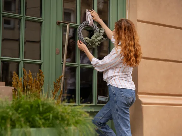 Persoană care agață o coroniță la ușă - Foto: Freepik (Imagine cu rol ilustrativ)Frunză de dafin la ușă - Foto: Freepik (Imagine cu rol ilustrativ)