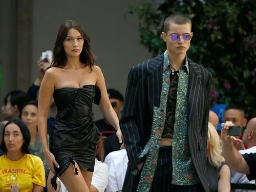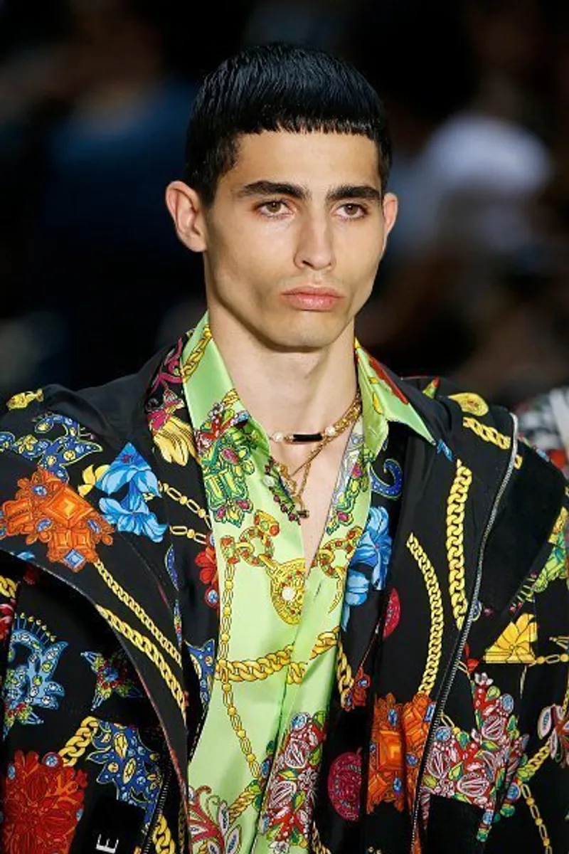 De asemenea, Versace propune jachete cu buzunare plate, purtate la pantaloni scurți și cu o gentuță cu aer feminin. Prezentarea masculină Versace s-a încheiat cu o tranziție către moda feminină, Bella Hadid apărând pe scenă într-un mini confortabil din piele, alături de Kendall Jenner într-un mini mulat cu motive florale și cizme înalte.