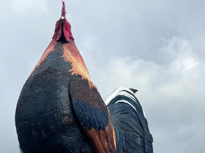 Nu numai că are forma păsării domestice, dar de fapt arată ca un cocoș uriaș realist care domină întreaga zonă cu poziția sa impunătoare.