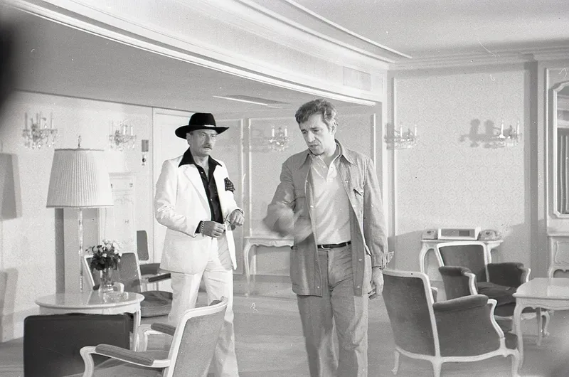 Amza Pellea și regizorul Sergiu Nicolaescu, în „Apartamentul Imperial” de la Intercontinental, înainte de filmarea unei scene din film - Foto: Studiourile Buftea