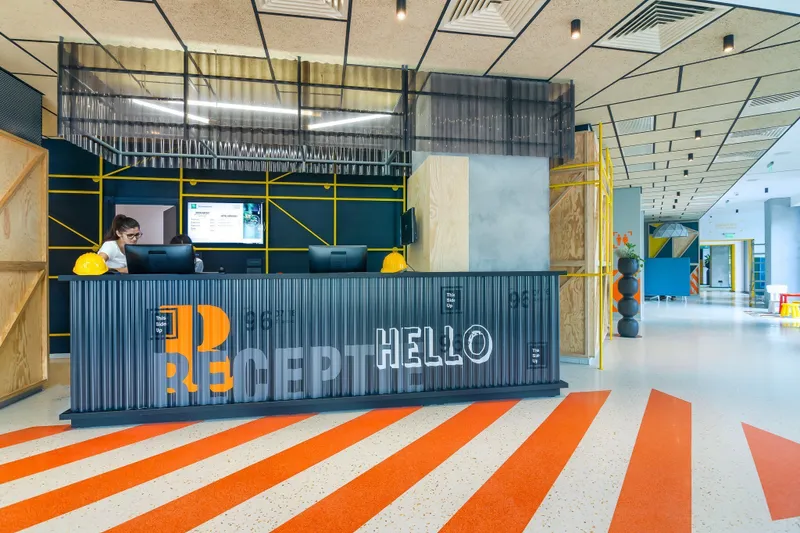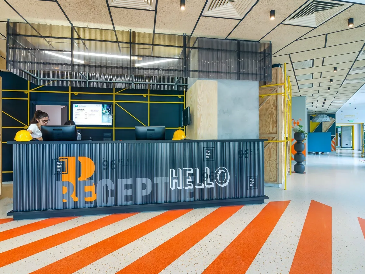 ”Provocarea noastră a fost să combinăm două idei diferite: ideea de bucurie, tinerețe, umor de calitate și creativitate cu aceea a unui șantier de construcții, care are un caracter dinamic, efervescent, active, și este în continuă schimbare. Așadar, am urmărit să declanșăm emoții pozitive concentrându-ne pe frumusețea neașteptată a unui șantier de construcții, de la care am preluat elemetele care au îmbogățit proiectul prin asocieri indite de forme și texturi. Prin culorile saturate, materialele și contururile îndrăznețe, am reprezentat diferite elemente de construcție, dezvăluind o lume modernăși plină de optimism. Tema a fost unică și ne-a stârnit entuziasmul, iar designul și-a atins armonios forma finală, prin transpunerea tuturor detaliilor, a mobilierului interior și a finisajelor în ceea ce am numit