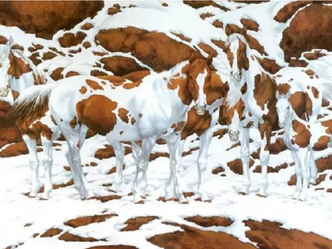 Această iluzie obscură a calului a fost creată de artista Bev Doolittle și ridică întrebarea: câți cai sunt cu adevărat?