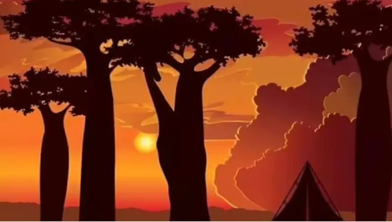 Dacă aveți nevoie de o mână de ajutor, încercați asta - animalul pe care îl căutați este ascuns în umbrele pe care soarele apus le aruncă asupra copacilor. Nu veți găsi girafa pândind în nori sau ascunsă în spatele cortului din dreapta jos.