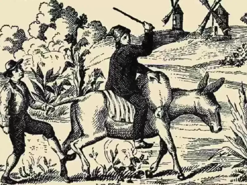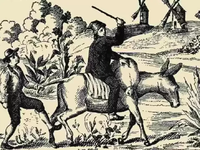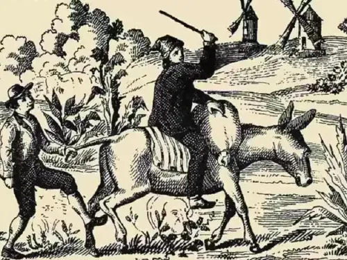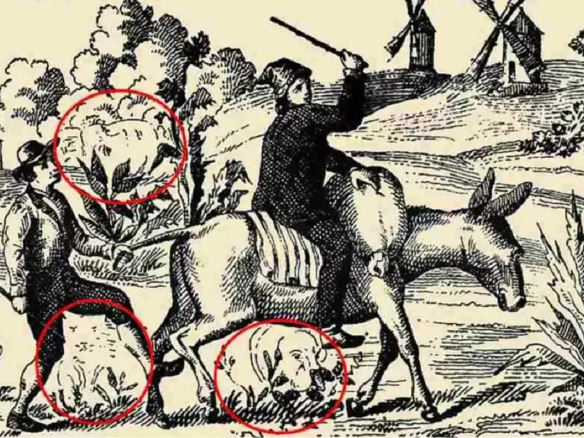 Între picioarele bărbatului care se țien de coada măgărușui se vede pisica, iar sub măgar se vede câinele.