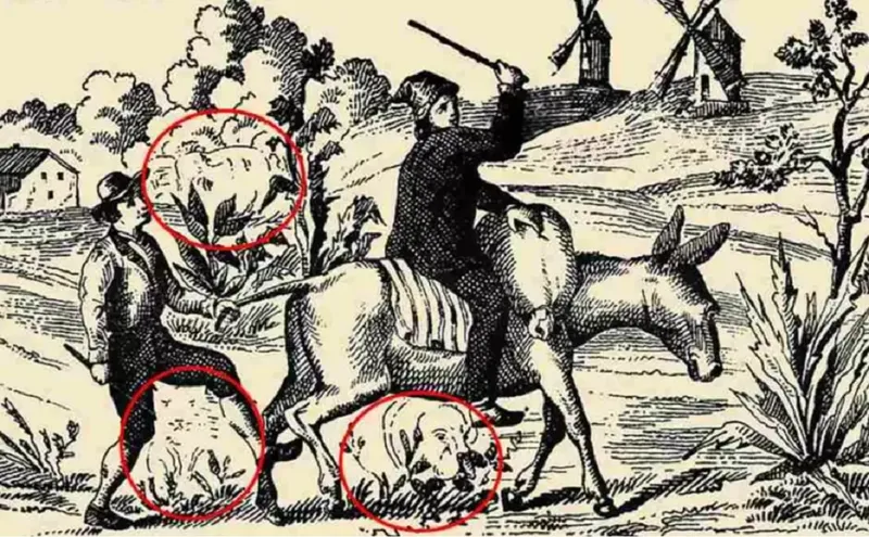 Ascunse în modelele complicate se află o femeie, o pisică și un câine, care așteaptă să fie descoperite de cei mai atenți ochi.