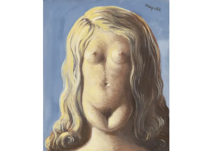 Tabloul a fost realizat de Magritte (1898-1967) în 1951 şi suprapune un chip şi un trup de femeie.