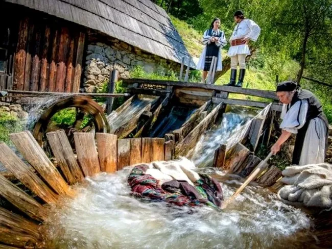 Instalaţia cu ciocane pentru bătut ţesǎturile este acţionată din afara construcţiei de o roată mare din lemn cu paleţi, pusă în mişcare de forţa apei.