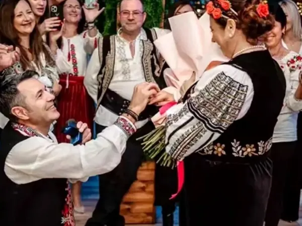 Mihaela și Sorin s-au îmbrăcat amândoi în în costume populare cum cerea dress-code-ul petrecerii de la hotel, iar la un moment dat bărbatul s-a așezat în genunchi în fața iubitei sale și i-a pus întrebarea îndelung așteptată.