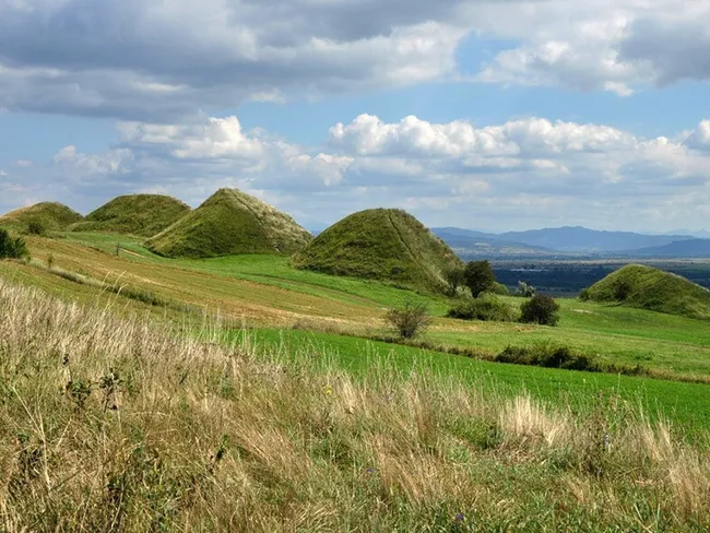Sunt opt movile, care ating aproape câte 30 de metri înălţime, dispuse pe două şiruri, aşezate în ordinea mărimii. Una dintre legende spune că piramidele au fost ridicate pe vremea dacilor, iar în măruntaiele movilelor s-ar găsi chiar şi nişte comori.