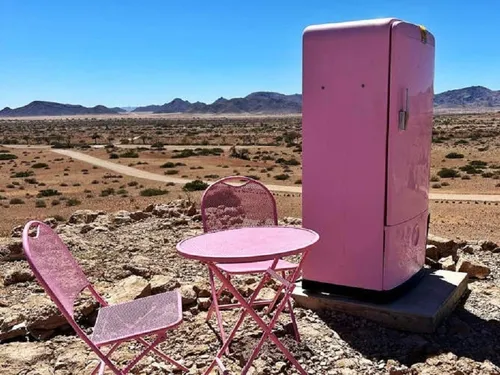 Imaginați-vă că mergeți printr-un deșert african, cu nimic altceva decât stânci și munți sterpi cât vedeți cu ochii, și dintr-o dată dați peste un frigider roz și o masă de metal cu două scaune mici lângă ea.