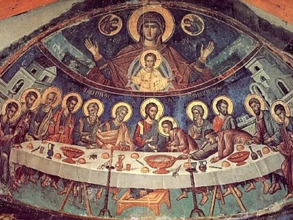 În acea seară, Mântuitorul și cei 12 ucenici ai săi - viitorii Apostoli, cu excepția trădătorului Iuda - se așează la masă, iar Iisus instituie, printre altele, Taina Împărtășaniei.