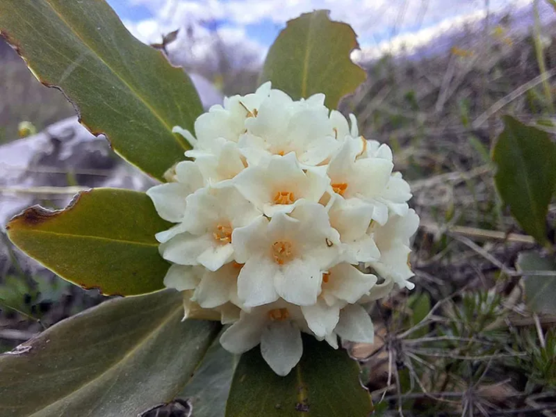 Frunzele sunt de culoare verde lucitor, lipsite de pețiol şi dispuse în rozete spre vârful ramurilor. Florile sunt albe-gǎlbui, cu aspect plǎcut, frumos mirositoare şi foarte primǎvǎratice.