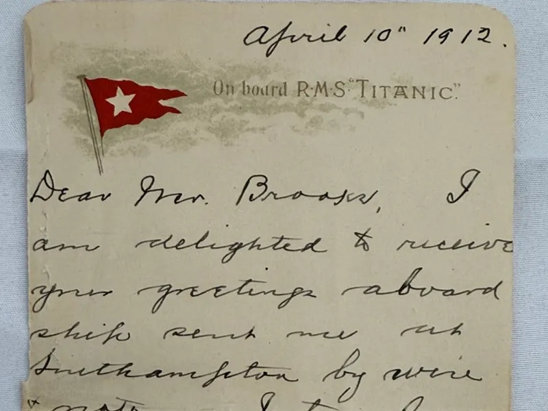 O scrisoare „profetică” a unui supraviețuitor al Titanicului, vândută la licitație cu 400.000 $. Scrisoarea era datată 10 aprilie 1912, ziua în care el s-a îmbarcat pe Titanic, la Southampton, şi cu cinci zile înainte ca nava să se scufunde.