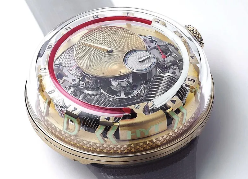 HYT este singurul producător elvețian de lux care folosește fluide pentru a-și alimenta parțial ceasurile. Modelul H2O are calibrul 51 mm, iar cadranul este protejat de un dom din sticlă de cristal de safir. Orele sunt indicate spectaculos de un lichid roșu.
