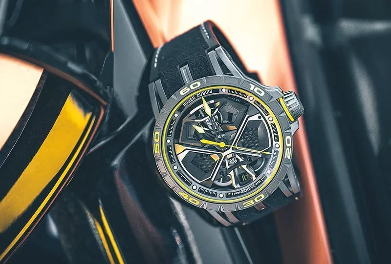 Roger Dubuis Excalibur Huracàn Performante se asortează perfect cu supercar-ul omonim Lamborghini. Carcasa de 45 mm este din titan, iar mecanismul automatic RD630 are o rezervă de putere de 60 de ore.