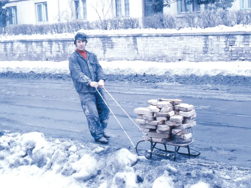 Funia e întinsă la maxim, sania alunecă greu pe asfalt, mai prinde doar o bucată din zăpada de la margine. În timpul acestei corvoade, este fotografiat de un personaj ciudat, străin de acel loc, singurul care are curaj să meargă prin oraș, la vedere, cu un aparat foto Pentax. „Cred că era mai ușor să tragă sania pe stradă“, a notat David în dreptul acelei fotografii făcute în 1988. A postat instantaneul pe pagina de Facebook „My Fulbright Year in România“, pe care a creat-o treizeci de ani mai târziu, tocmai pentru a le arăta și altora imaginile surprinse într-o țară care nu mai există.