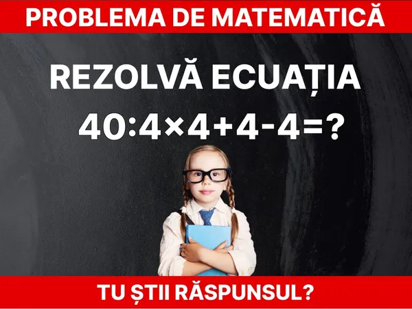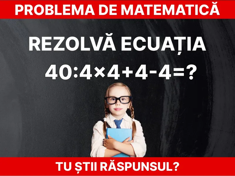 Problema de matematică: ”40:4x4+4-4=?” pentru copiii de clasa a III-a. Rezolvă în 20 de secunde
