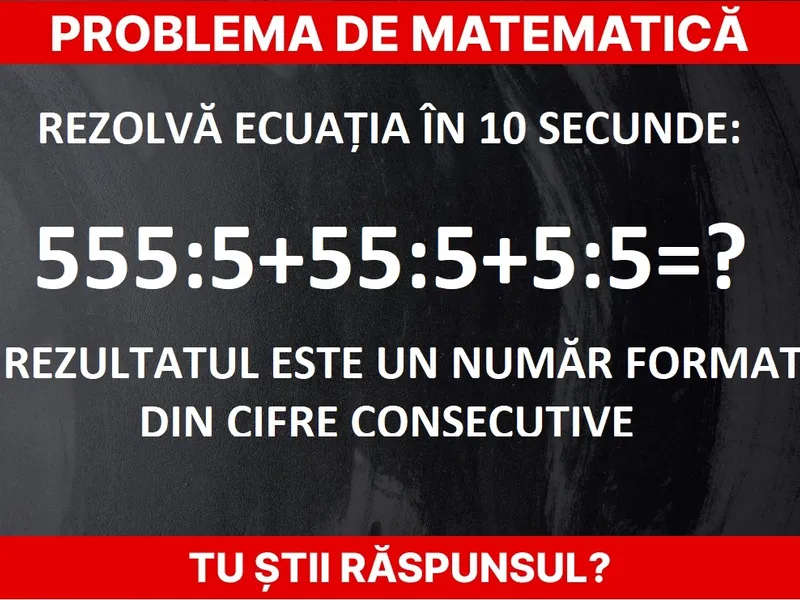 Vă propunem o problemă de matematică al cărui rezultat este un număr format din 3 cifre consecutive. Pentru că de fapt v-am dat răspunsul, rezolvați ecuația: 555:5+55:5+5:5=? în 10 secunde.