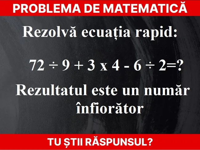 Pentru ecuația 72 ÷ 9 + 3 x 4 - 6 ÷ 2=? se aplică ordinea operațiilor în matematică, scrie fresherslive.com.
