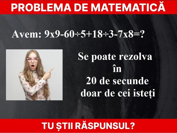 Problemă de matematică. 9x9-60÷5+18÷3-7x8=? Răspunde în 20 de secunde. Semnificația rezultatului