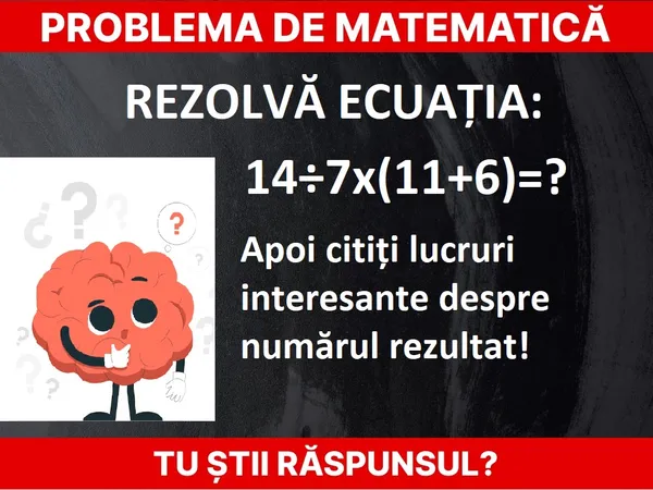 Problemă de matematică. Rezolvă ecuația 14÷7x(11+6)=? în 20 de secunde. Ce înseamnă numărul rezultat