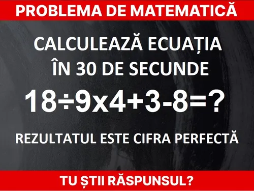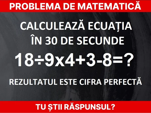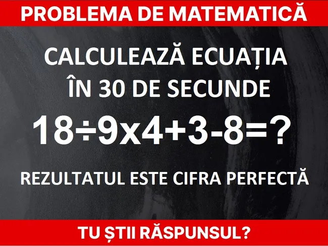 Problemă de matematică. Rezolvă ecuația: 18÷9x4+3-8=? în 30 de secunde. Rezultatul, o cifră perfectă
