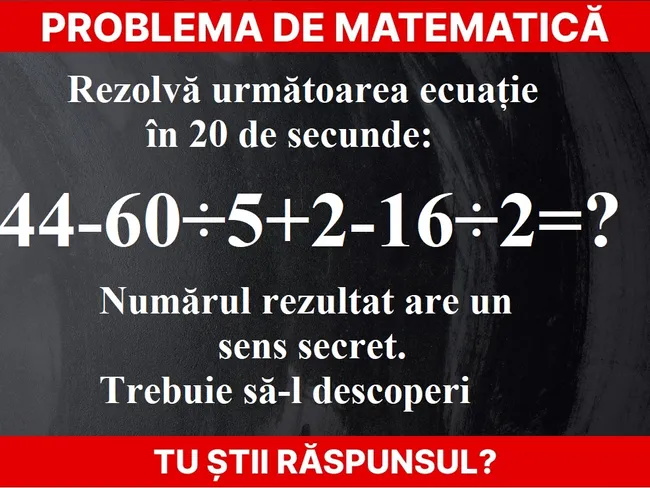 Problemă de matematică. Rezolvă ecuația: 44-60÷5+2-16÷2=? Rezultatul este un număr cu un sens secret