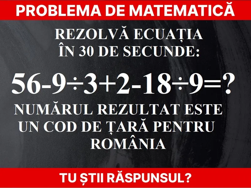 Problemă de matematică. Rezolvă ecuația: 56-9÷3+2-18÷9=?. Rezultatul este un cod de țară al României