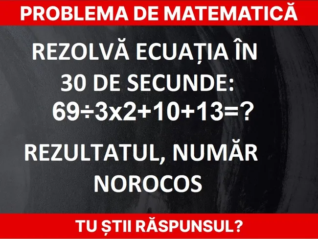 Problemă de matematică. Rezolvă ecuația: 69÷3x2+10+13=? în 30 de secunde. Rezultatul, număr norocos