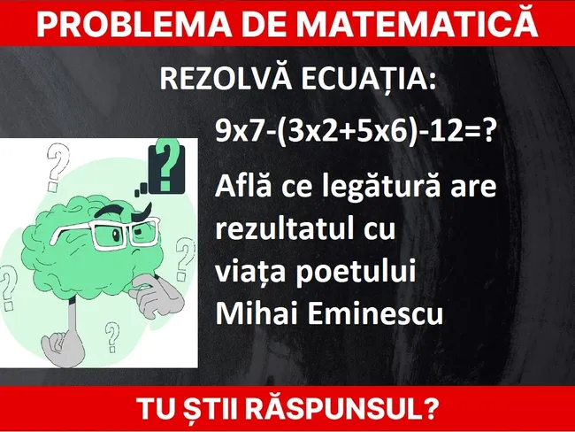 Problemă de matematică. Rezolvă ecuația: 9x7-(3x2+5x6)-12=? Numărul rezultat, legat de Eminescu
