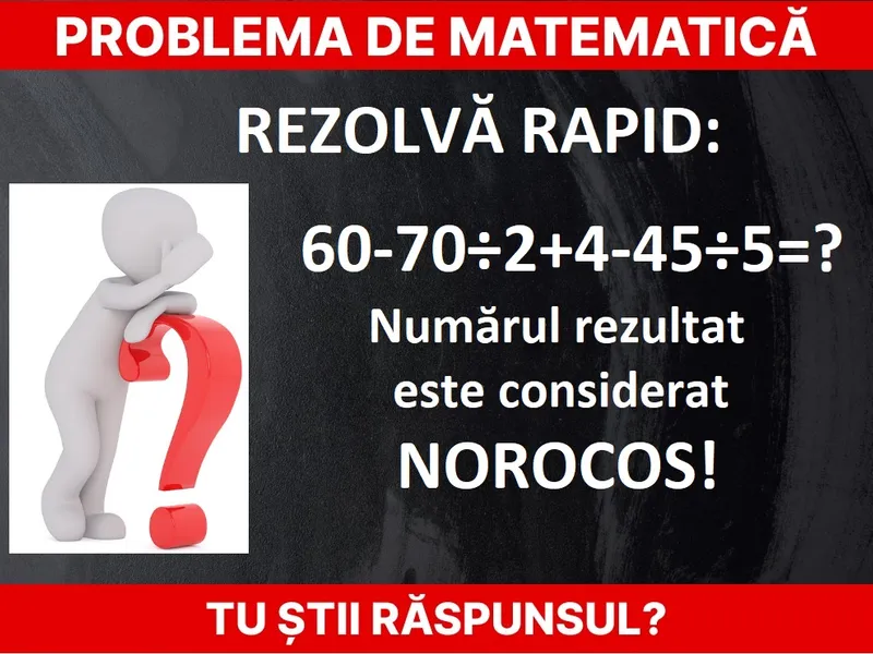 Problemă de matematică. Rezolvă rapid: 60-70÷2+4-45÷5=? Ce semnificație are numărul rezultat
