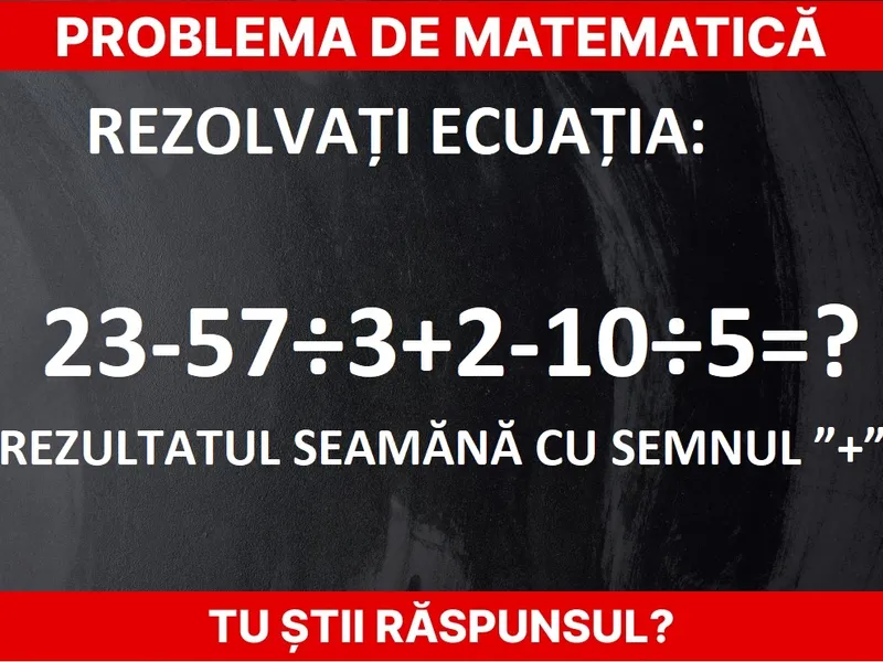 Problemă de matematică: Rezolvați ecuația: 23-57÷3+2-10÷5=?, în 30 de secunde. Vezi rezultatul?