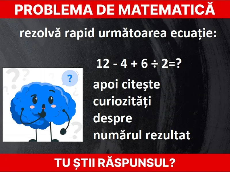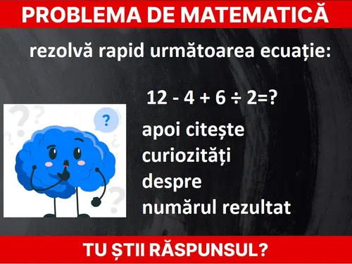 Problemă de matematică ușoară. Rezolvă: 12 - 4 + 6 ÷ 2=? rapid. Cât este rezultatul?