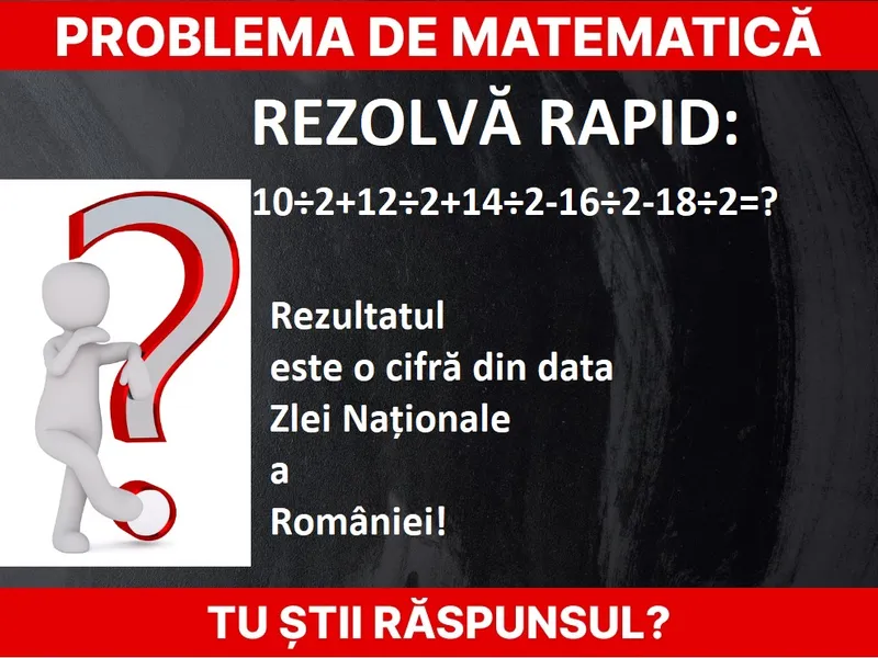 Problemă de matematică.10÷2+12÷2+14÷2-16÷2-18÷2=? Rezultatul, cifră din data Zilei Naționale