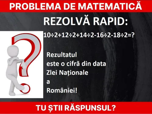Problema de matematică de azi are un rezultat foarte frumos. Este o cifră cu o simbolistică aparete, unde mai pui ca face parte și din data unei zile foarte importante pentru români.