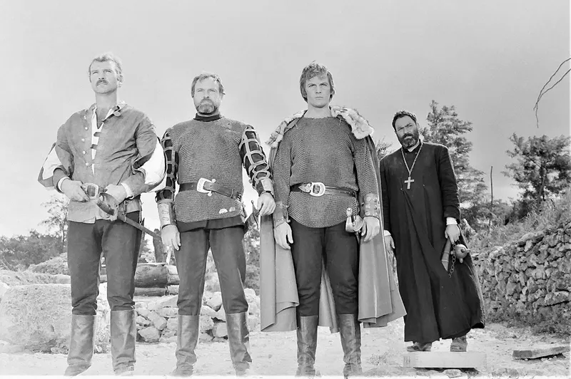 Septimiu Sever, al doilea din stânga, în rolul lui Radu Buzescu, alături de Ilarion Ciobanu, Florin Piersic și Mircea Albulescu - Foto: Facebook/Studiourile Buftea
