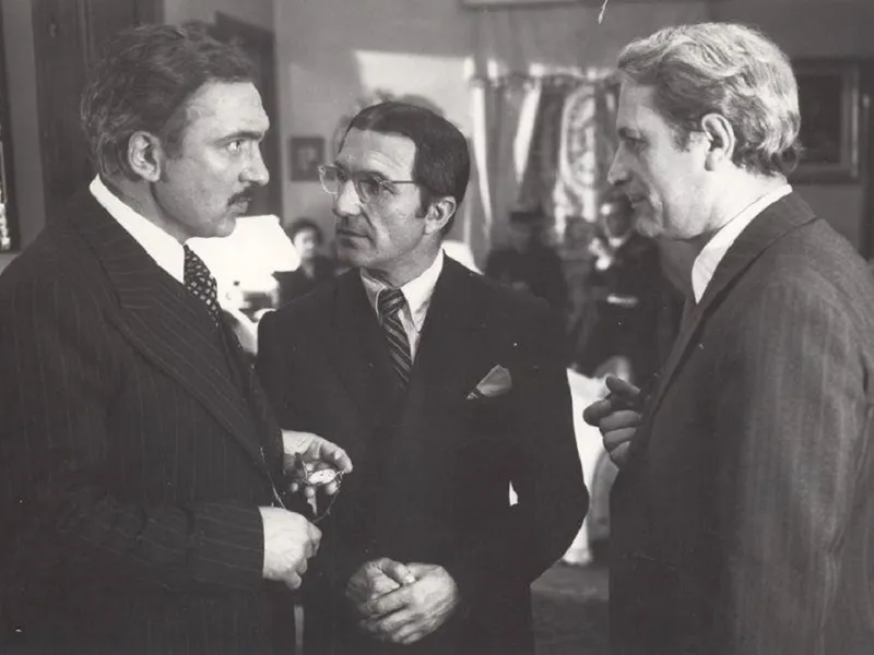 Ion Pacea, primul din dreapta, în „Bietul Ioanide”, alături de marii actori Gheorghe Dinică și Constantin Codrescu - Foto: Facebook/Studiourile Buftea