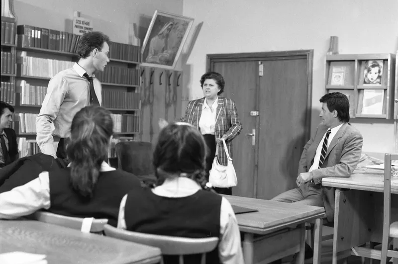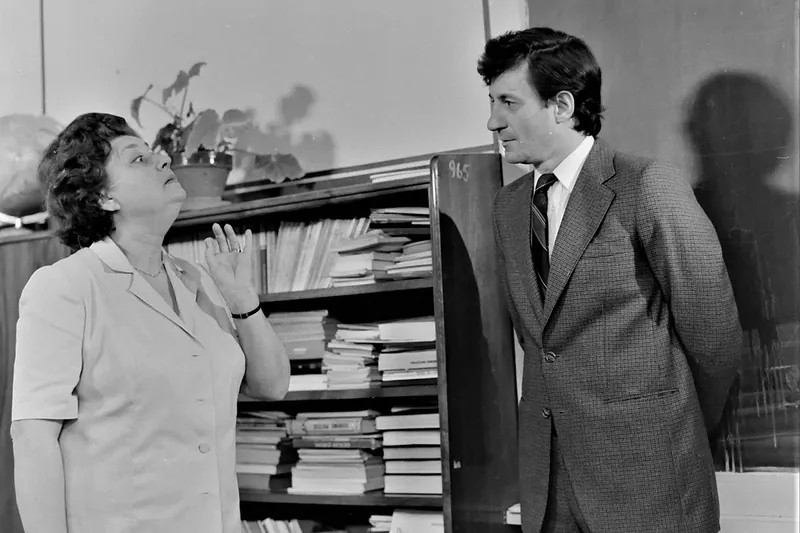 Neuitata profesoară „Isoscel” din „Liceenii”, mereu în opoziție cu ideile lui „Socrate”, profesorul de filosofie intepretat de Ion Caramitru - Foto: Facebook/Cineclic