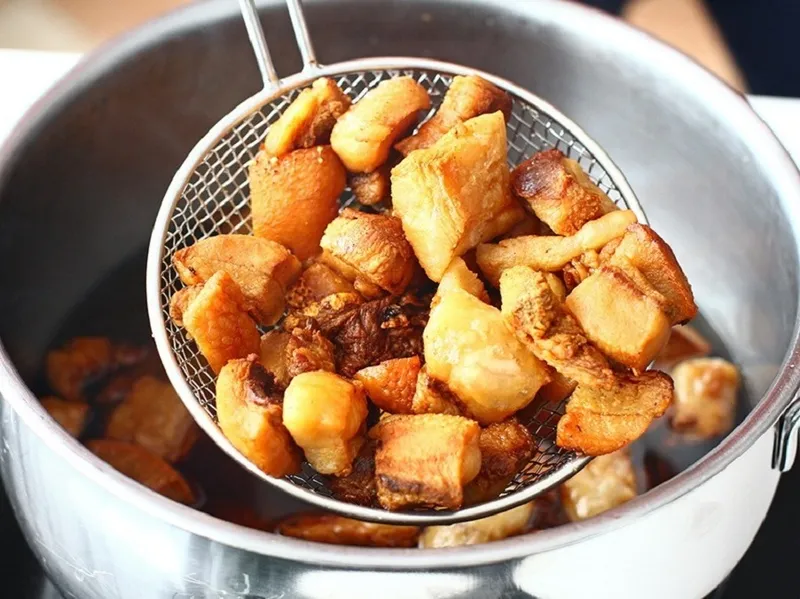 Cât de repede posibil, se scot jumările din untura fierbinte cu o spumieră mare și se pun separat să se scurgă într-o sită.