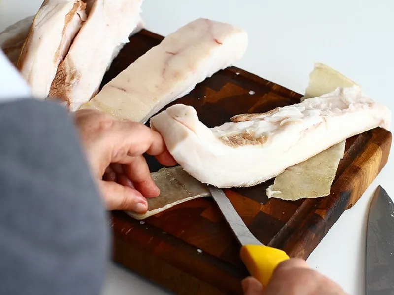 2) Mai întâi, slănina se taie în fâșii, pe cât posibil egale. Apoi, cu ajutorul unui cuțit bine ascuțit, se desprinde șoriciul. Pentru asta, introduceți lama cuțitului între slănină și șorici. Prindeți slănina de capătul cel mai apropiat, ridicând-o ușor.