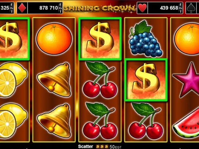 Shining Crown – este „regele” jocurilor cu fructe și șeptari din ultimii ani, datorită Payout-ului ridicat și volatilității scăzute, care face ca rotirile câștigătoare să fie dese. Are funcția Gamble și patru jackpoturi progresive (Jackpot Cards). Coroana strălucitoare este „Wild”, iar dolarul și steluța aurie sunt simboluri Scatter;