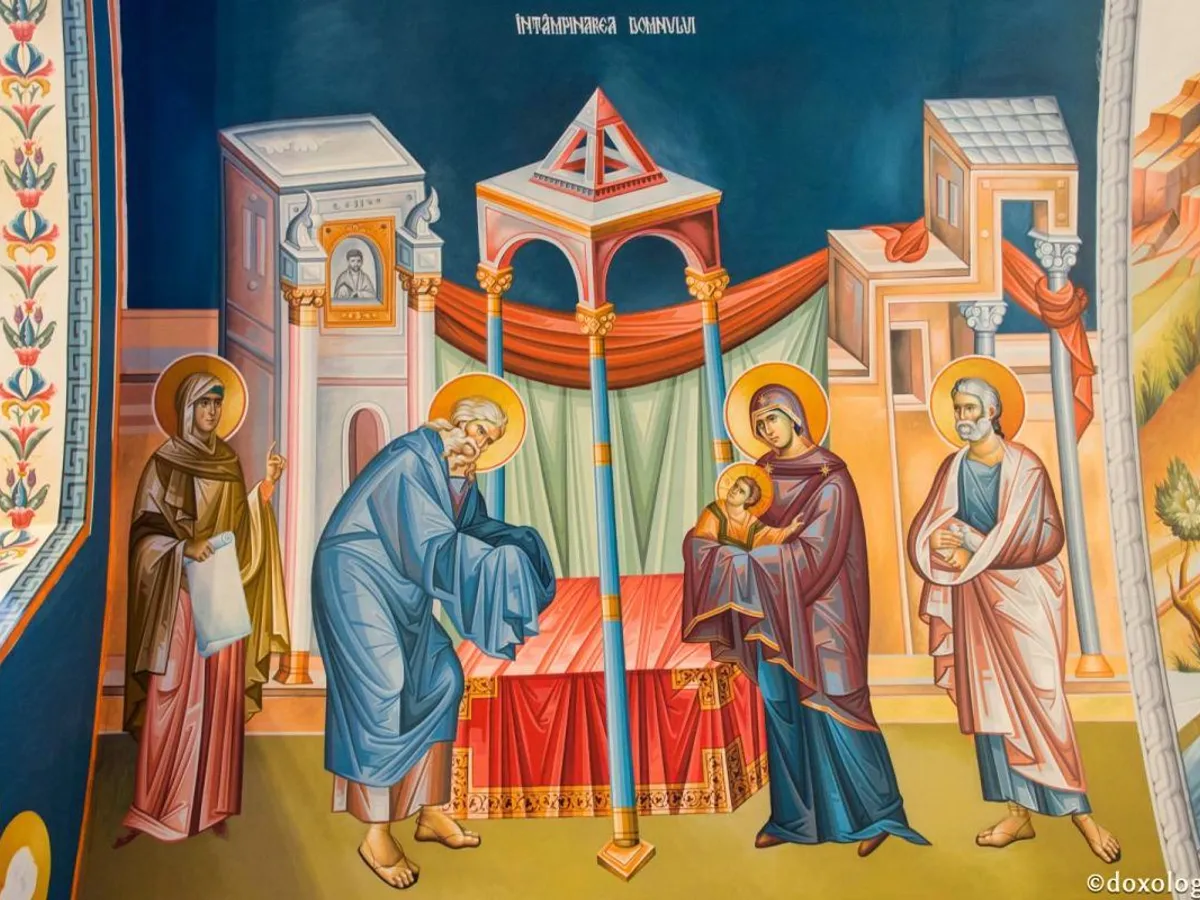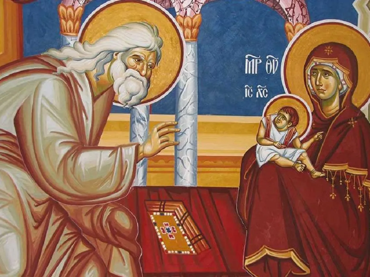 Când Maica Domnului, la patruzeci de zile după naştere, L-a adus pe Prunc la templul din Ierusalim să fie închinat Domnului, ca orice întâi născut de parte bărbătească, Dreptul Simeon a ieşit în întâmpinarea Pruncului, L-a luat în braţele sale şi a spus: "Acum slobozeşte pe robul Tău, după cuvântul Tău, în pace. Că ochii mei văzură mântuirea Ta" (Luca 2; 29, 30).