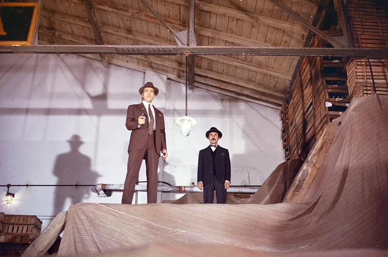 Într-o scenă clasică din „Un comisar acuză” (1974), avându-l în spate pe marele Gheorghe Dinică, intepretul neuitatului personaj Lăscărică - Foto:Facebook/Studiourile Buftea