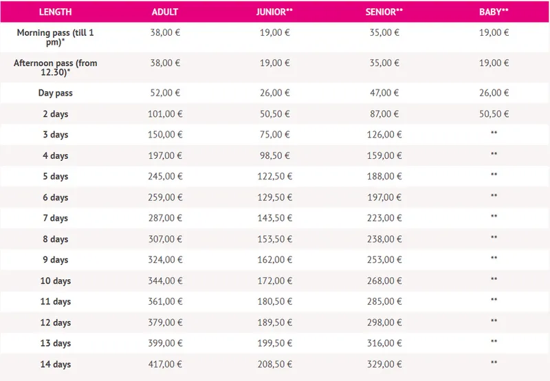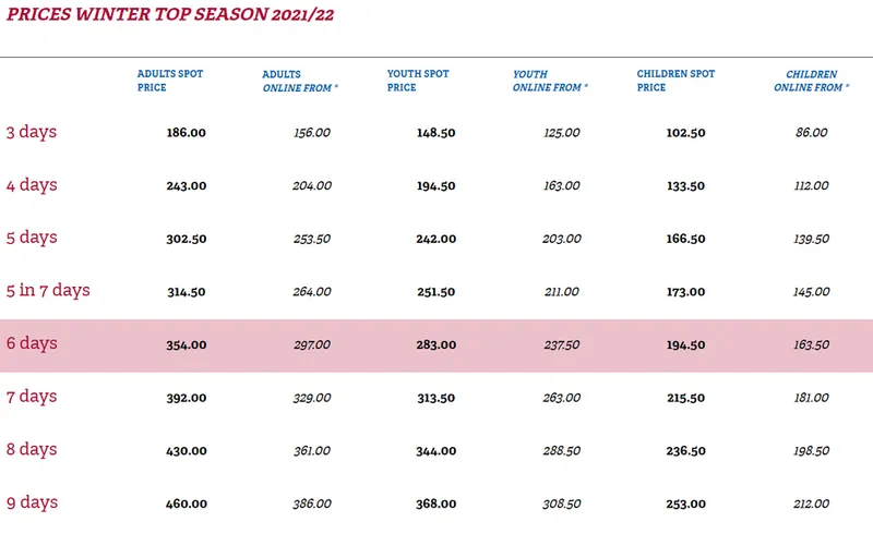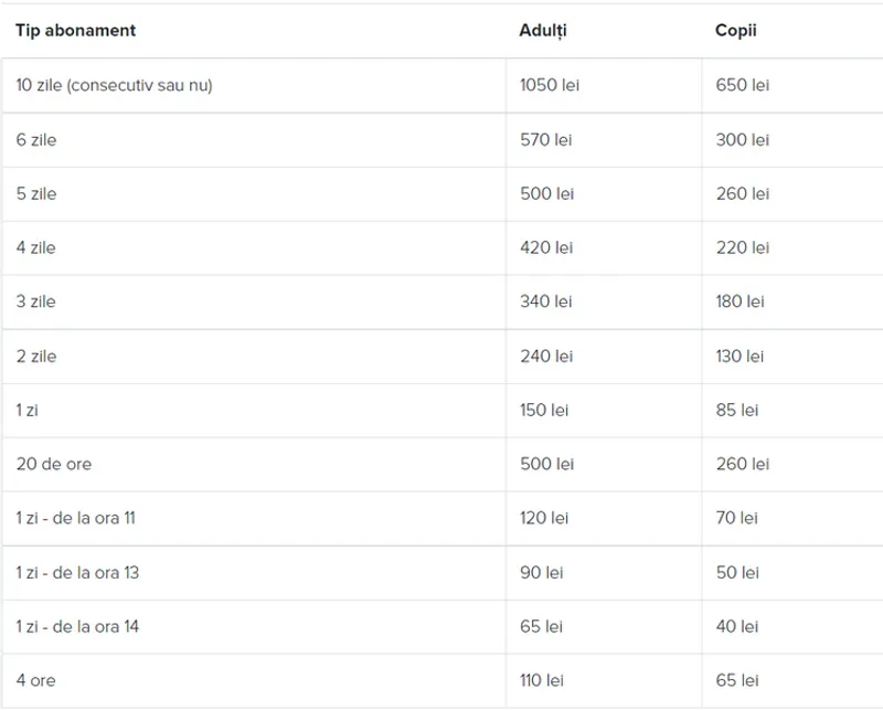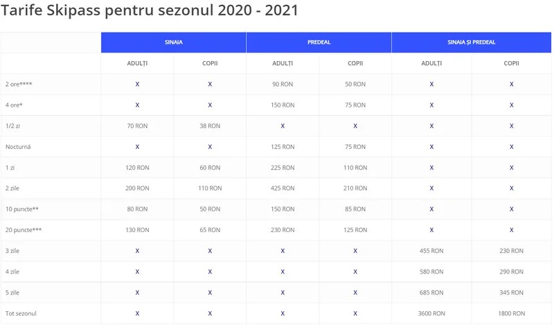 Conform teleferic.ro, în Sinaia, Predeal și Bușteni, ski pass-ul de o zi pentru adulți costă în această iarnă 225 de lei, adică 45 €/zi, la un curs de schim de 5 lei/€. În Austria, la Ischgl, ski pass-ul pentru o zi costă 59,5 € (197 de kilometri de pârtii), iar Ötztal, unde sunt peste 350 de kilometri de pârtii amenajate, dacă ski pass-ul este achiziționat online, prețul este de 156 €/3 zile, adică 52 €/zi.
