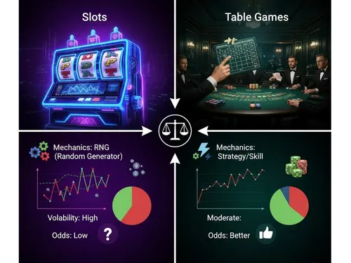 Slots vs. jocuri de masă: diferențe în mecanică, volatilitate și șanse de câștig (P)